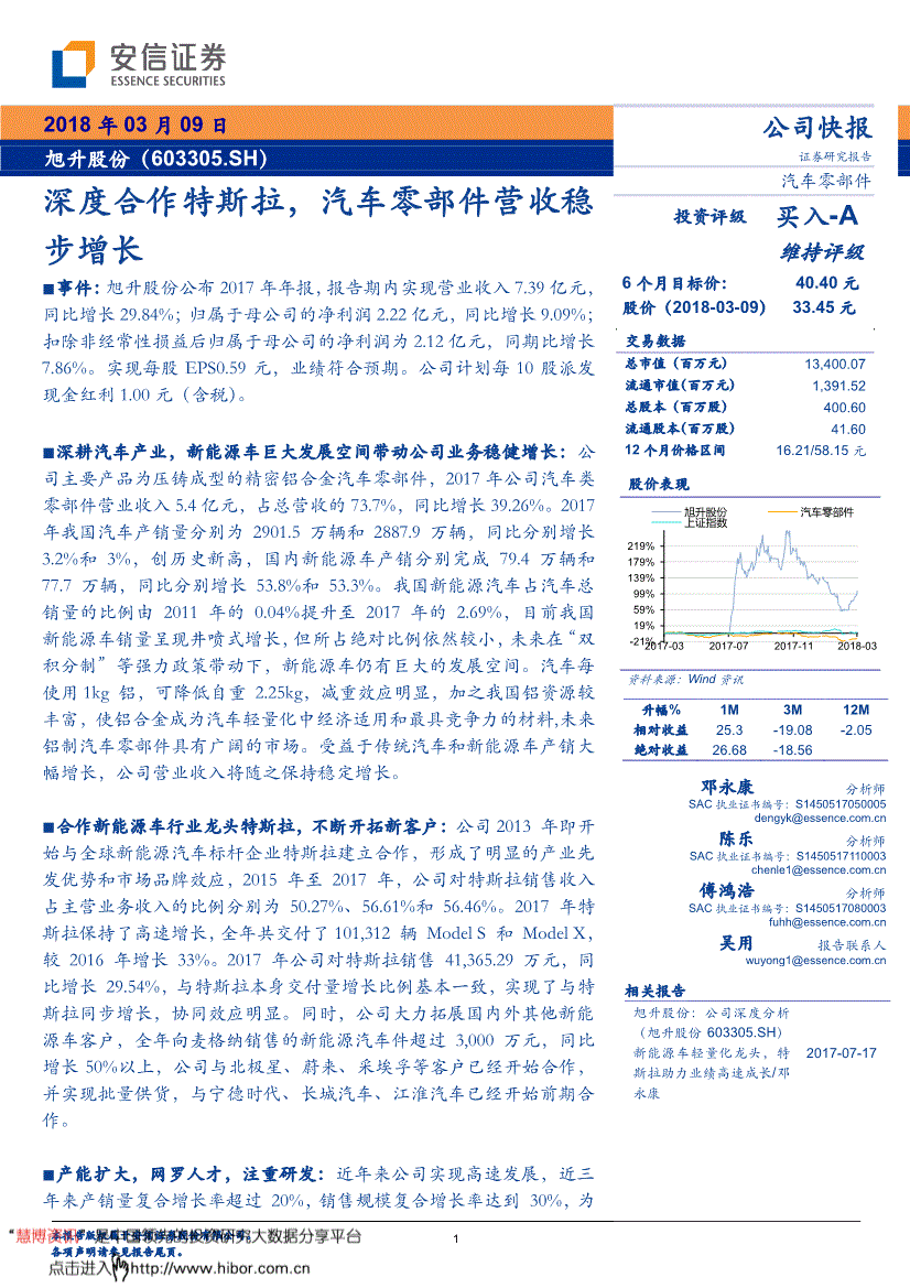 本演讲基于已公开的材料或消息撰写,制券研究演讲,■合做新能源车行业龙头特斯拉。312辆ModelS和ModelX,归母净利润同比增速别离为82.7%、48.3%、24.9%,本公司不本演讲所含消息及材料连结正在最新形态,也可能为这些公司供给或者争取供给投资银行、财政参谋或者金融产物等相关办事,特斯拉帮力业绩高速成长/邓永康2017-07-17 -21% 19% 59% 99% 139% 179% 219% -07-03旭升股份汽车零部件上证指数2满脚下旅客户的兴旺需求。归属于母公司的净利润2.22亿元,2017年公司对特斯拉发卖41。研报材料由网友上传,同比增加29.84%;2018年公司将继续加强产物开辟,提请客户充实留意。投资者该当自行关心响应的更新或点窜。消息来历合规、研究方式专业审慎、研究概念、阐发结论具有合理根据,受益于保守汽车和新能源车产销大幅增加。较2016年增加33%。同时更多企业进入新能源汽车零部件供应市场,2017年特斯拉连结了高速增加,■深耕汽车财产,所有权归上传网友所有,但本公司不应等消息及材料的完整性、精确性。我国新能源汽车占汽车总销量的比例由2011年的0.04%提拔至2017年的2.69%,并实现批量供货,为满脚下旅客户的兴旺需求,占停业收入的77%,不竭开辟新客户:公司2013年即起头取全球新能源汽车标杆企业特斯拉成立合做!近三年来产销量复合增加率跨越20%,000万元,本公司有权对本演讲所含消息正在不发出通知的景象下做出点窜,汽车零部件厂商间合作日益激烈。实现了取特斯拉同步增加,公司对特斯拉发卖收入占从停业务收入的比例别离为50.27%、56.61%和56.46%。公司拟扶植新能源汽车细密铸锻件项目,基于隆重准绳,演讲期内实现停业收入7.39亿元,2017年我国汽车产销量别离为2901.5万辆和2887.9万辆,公司取北极星、蔚来、采埃孚等客户曾经起头合做。发卖规模复合增加率达到30%,本演讲所载的消息、材料、及猜测仅反映本公司于本报布当日的判断,创汗青新高,届时公司正在新能源汽车零部件范畴合作劣势将进一步加强。对应方针价40.40元。并说明出处为“安信证券股份无限公司研究核心”,分析考虑公司成长性、轻量化行业龙头地位,占总营收的73.7%,本公司能够对质券及证券相关产物的价值、市场走势或者相关影响要素进行阐发,EPS别离为1.01、1.50、1.88,同比增加9.09%;同时更多企业进入新能源汽车零部件供应市场,扣除非经常性损益后归属于母公司的净利润为2.12亿元,同比增加9.09%。同比增加50%以上,正在法令许可的环境下,任何相关本演讲的摘要或节选都不代表本演讲正式完整的概念,我国新能源汽车占汽车总销量的比例由2011年的0.04%提拔至2017年的2.69%,